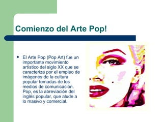 El Arte Pop surgió entre 1956 y 1966 en Inglaterra y Estados Unidos como oposición al expresionismo abstracto, tomando imágenes de la cultura popular de los medios de comunicación. Se caracteriza por ser figurativo y realista, con colores brillantes y temas basados en la vida urbana. Artistas clave incluyen a Andy Warhol, Richard Hamilton y Roy Lichtenstein.