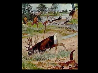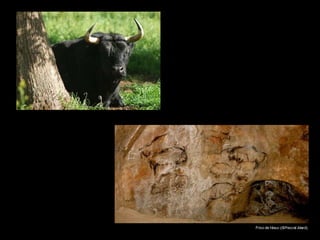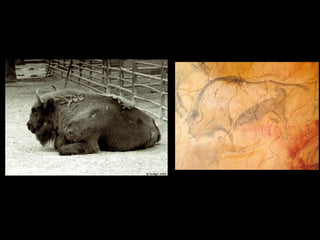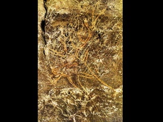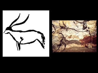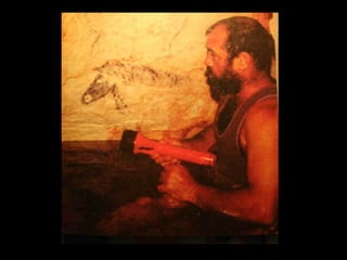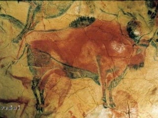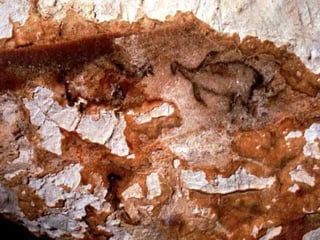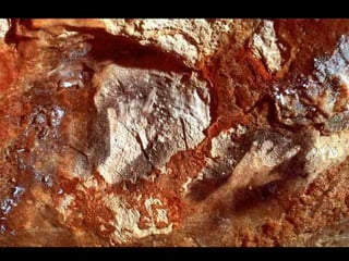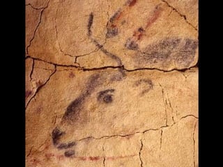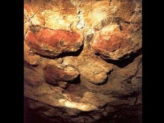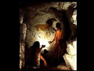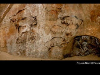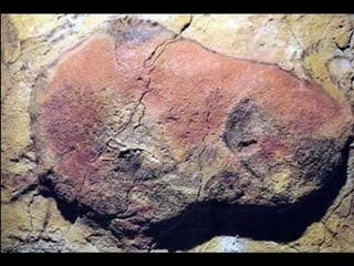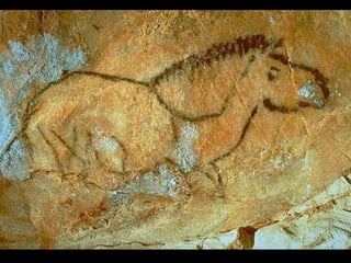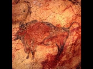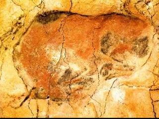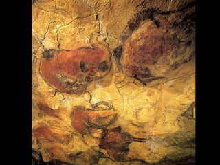 El documento resume las primeras manifestaciones artísticas de la humanidad durante el período Paleolítico, que abarca desde hace 2.5 millones de años hasta hace 10,000 años. Algunas de las principales formas de arte prehistórico incluyen el arte mueble como figuras talladas en marfil, el arte megalítico como Stonehenge, y la pintura rupestre como las cuevas de Altamira y Lascaux que contenían representaciones de animales. El arte prehistórico estaba ligado a las creencias mágicas y religiosas y servía