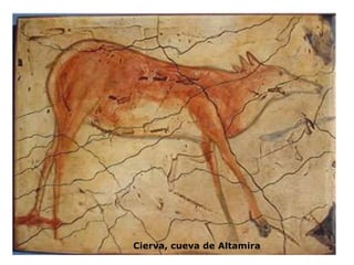 Este documento contiene imágenes de arte rupestre prehistórico encontrado en cuevas como Altamira y Lascaux en España y Francia respectivamente, que representan animales como bisontes, ciervas y caballos. También incluye figuras como la Venus de Willendorf y Laussel, así como tallas en hueso y marfil de animales. Además presenta escenas de caza del Paleolítico Superior en España y construcciones megalíticas como dólmenes y cromlechs en las islas británicas y Baleares.