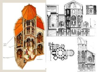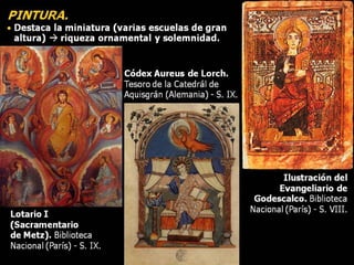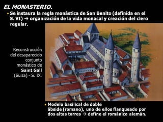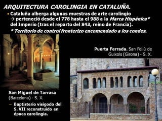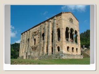 El documento resume el arte prerrománico en Europa y España. En Europa destaca el arte carolingio impulsado por Carlomagno, con obras como la Capilla Palatina de Aquisgrán. En España se desarrollaron los estilos visigodo, asturiano, mozárabe y de repoblación antes y durante la Reconquista, con iglesias que mostraban influencias bizantinas y califales. Manuscritos como los Beatos ilustraron el periodo de repoblación cristiana.