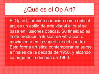 El Op Art, también conocido como arte óptico, es un estilo de arte visual que se basa en ilusiones ópticas para producir la ilusión de movimiento en una obra estática. Surgió a finales de la década de 1950 y alcanzó su apogeo en la década de 1960, utilizando líneas, formas geométricas, contrastes de color y otros efectos para crear la percepción de vibración, inestabilidad o confusión sin movimiento real. El arte óptico también se aplicó en la moda y el diseño textil a