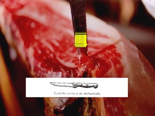 El documento describe las partes de un jamón ibérico y las herramientas utilizadas para cortarlo, como cuchillos y jamoneras. Explica los pasos para cortar de forma segura, retirando la corteza y el tocino de manera uniforme. Recomienda guardar el tocino cortado en dados para usarlo en cremas y purés. A continuación, detalla las direcciones correctas para cortar las diferentes partes del jamón, como la babilla, la maza y la punta, con lonchas finas y rectas de unos 5 cm.