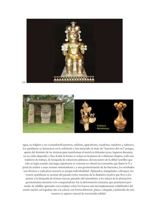 Los quimbayas habitaban el territorio de Colombia prehispánica y se destacaron por su habilidad en la orfebrería, logrando estilos depurados y finos en delicadas joyas de oro. Crearon elegantes vasijas decoradas con pintura negativa, figuras antropomorfas y urnas funerarias. A pesar de seguir normas geométricas, cada pieza muestra individualidad, desde naturalismo hasta inicios de abstracción. Practicaron deformación craneana en recién nacidos para cambiar su aspecto natural.