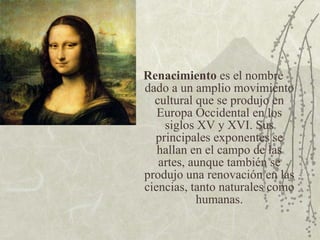 El Renacimiento fue un amplio movimiento cultural que se produjo en Europa Occidental entre los siglos XV y XVI, fruto de la difusión de las ideas humanistas que promovieron una nueva concepción del hombre y del mundo, retomando elementos de la cultura clásica. Los artistas renacentistas rompieron con la tradición gótica de la Edad Media y se inspiraron en los modelos antiguos, desarrollando nuevas técnicas pictóricas y arquitectónicas. Figuras como Leonardo da Vinci y Miguel Ángel representaron esta nueva actitud que