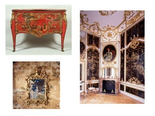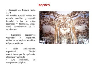 El estilo rococó apareció en Francia en la década de 1730 y se caracterizó por sus elementos decorativos vegetales y curvos, utilizados en muebles, esculturas y otras artes aplicadas. En arquitectura, los interiores se decoraron profusamente con motivos ondulantes y asimétricos. La pintura rococó retrató escenas galantes y pastoriles con colores suaves, celebrando la belleza femenina. El rococó fue un estilo aristocrático y elegante pero superficial.