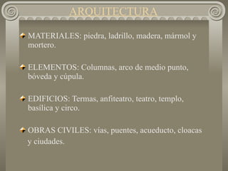 El documento describe el arte romano, incluyendo la arquitectura, escultura y otras artes. La arquitectura romana se caracteriza por el uso de materiales como piedra, ladrillo, madera y mármol. Los edificios romanos más comunes incluyen termas, anfiteatros, teatros, templos y basílicas. También construyeron obras civiles como vías, puentes y acueductos. La escultura romana incluye retratos, relieves y estatuas exentas de figuras como Augusto y Marco Aure