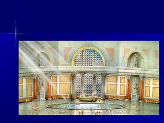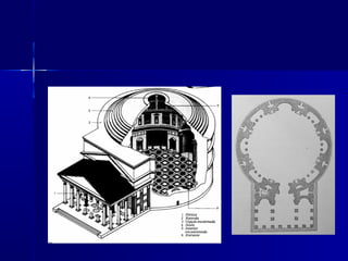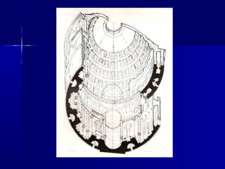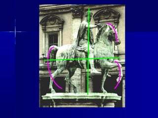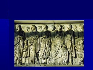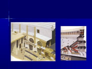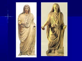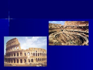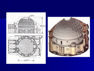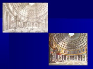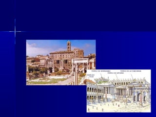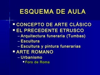 El documento resume el arte clásico romano, incluyendo su arquitectura, escultura y pintura. La arquitectura romana se caracterizó por su funcionalidad, simetría y colosalismo, construyendo templos, edificios de entretenimiento como teatros y anfiteatros, e ingenierías como acueductos y calzadas. La escultura romana incluyó retratos realistas de la época republicana y los retratos imperiales, así como relieves históricos en monumentos como la Columna Trajana. La pintura se