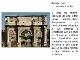 El documento describe varias formas de arquitectura romana conmemorativa y funcional. Describe los arcos de triunfo romanos que conmemoraban victorias militares y eventos históricos. También describe columnas conmemorativas que se erigían para honrar generales y emperadores. Finalmente, describe otras estructuras funcionales romanas como acueductos para transportar agua, puentes de arco para cruzar ríos, y domus como residencias urbanas de la élite con atrios y patios centrales.