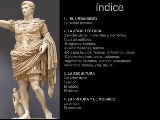 Este documento resume los principales aspectos de la arquitectura, el urbanismo, la escultura, la pintura y el mosaico de la civilización romana. Describe las características de la ciudad romana típica y de diferentes tipos de edificios como templos, basílicas, anfiteatros y viviendas. También explica los materiales y funciones de la escultura romana, con ejemplos de retratos e historias. Por último, presenta ejemplos de pintura y mosaico romanos y sus temas más comunes.