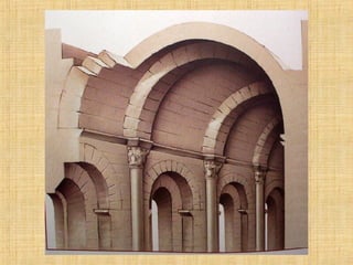 El documento resume las características arquitectónicas del estilo románico. Se caracteriza por la monumentalidad, la perdurabilidad y por crear un espacio interior en las iglesias. Las iglesias románicas siguen la planta de cruz latina y se componen de naves, crucero y cabecera. Destacan el uso del pilar, el arco de medio punto y las bóvedas de cañón y arista. También se describe la arquitectura románica en diferentes países europeos como Francia, Alemania e Italia.