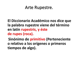 El documento habla sobre el arte rupestre, las manifestaciones artísticas más antiguas que involucran diferentes formas de expresión y comunicación humana. El arte rupestre fue realizado mediante técnicas como percusión, incisión o frotación sobre rocas, creando grabados como petroglifos que han resistido el paso de los siglos.