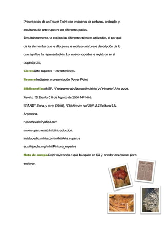 Este documento presenta un plan de lección sobre el arte rupestre. La lección comenzará mostrando imágenes de arte rupestre y preguntando a los estudiantes qué observan. Luego, se identificarán características como el soporte, los símbolos, y las técnicas utilizadas. Finalmente, se presentará un PowerPoint con más imágenes y detalles sobre el arte rupestre en diferentes países y culturas. El objetivo es brindar instancias para conocer e identificar las características de la pintura en el arte rupestre.