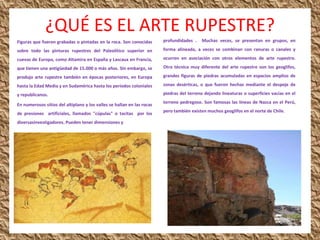 El arte rupestre son figuras grabadas o pintadas en rocas. Se encuentran principalmente en cuevas y aleros de Europa, Sudamérica y otras partes del mundo, con antigüedades de hasta 15,000 años. Los artistas crearon estas obras directamente sobre las rocas usando pinturas y herramientas de piedra. Representan animales, personas y símbolos, probablemente con propósitos religiosos o de comunicación.