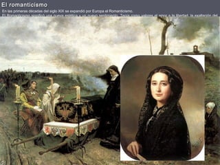 El documento resume los principales movimientos artísticos del siglo XIX como el romanticismo, el realismo y el modernismo. El romanticismo se expandió por Europa en las primeras décadas del siglo XIX y se caracterizó por valores como el individualismo y la exaltación de los sentimientos. El realismo se enfocó en retratar la vida cotidiana y los problemas sociales de la época. El modernismo surgió a finales del siglo XIX e inspiró sus formas curvas en la naturaleza, destacando en ciudades como Barcelona, donde Antonio Gaudí