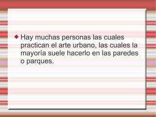 El documento discute el arte urbano, notando que muchas personas lo practican en paredes y parques. Sugiere que debería haber lugares designados donde la gente pueda grafitear y expresar su arte. Propone que el alcalde construya paredes u otros lugares en parques o áreas turísticas donde las personas puedan practicar el arte urbano de manera legal.