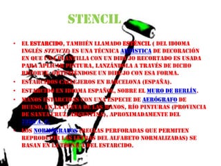 El documento trata sobre diferentes formas de arte urbano como el grafiti, el esténcil, las pegatinas y los carteles. Describe algunas de las ciudades más importantes para el arte callejero como Londres, Barcelona y Berlín. También presenta información sobre destacados artistas del esténcil como Banksy y Blek le Rat, señalando sus influencias y estilos pictóricos.