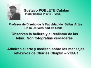 Este documento presenta obras de arte del pintor chileno Gustavo Poblete junto con reflexiones del actor y director Charles Chaplin sobre la vida. El documento incluye extractos del texto de Chaplin donde comparte experiencias personales y lecciones sobre amor, pérdida, felicidad, tristeza y sobre aprovechar la vida al máximo.