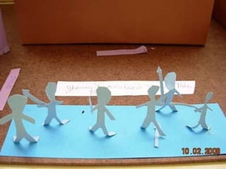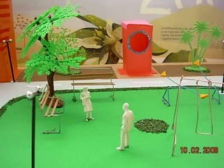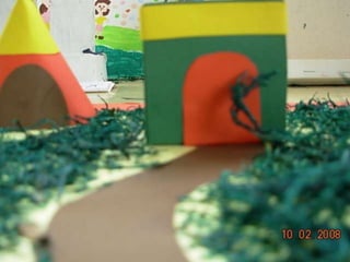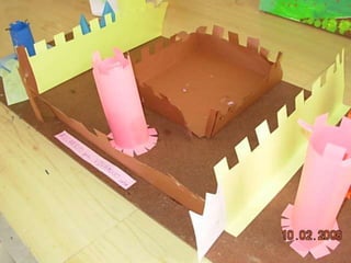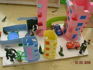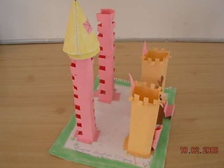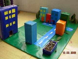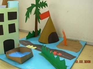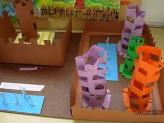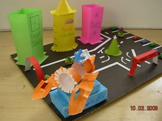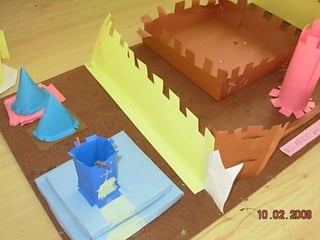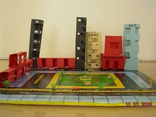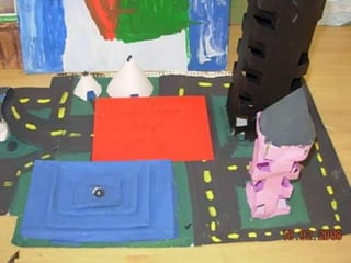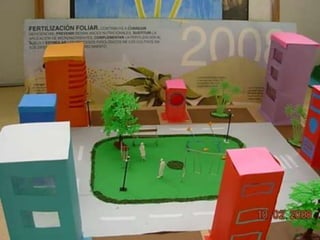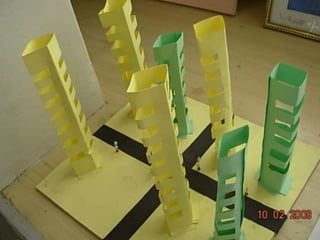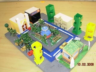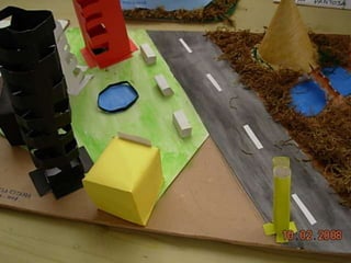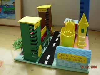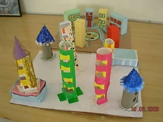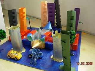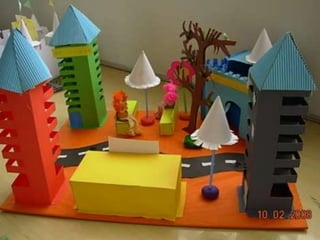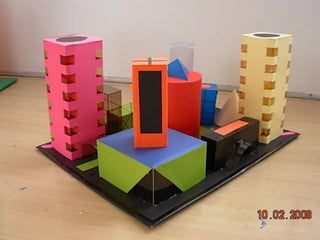 El documento habla sobre las construcciones geométricas que los alumnos de sexto grado han creado utilizando formas geométricas como círculos, rectángulos y triángulos en 3D. Muestra cómo nuestro entorno está diseñado con objetos de formas geométricas y cómo los estudiantes han representado sus trabajos usando estas formas tridimensionales.