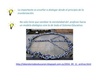 El documento presenta un trabajo realizado para un curso sobre convivencia escolar y prevención e intervención. Se enfatiza la importancia de enseñar el diálogo desde el inicio de la escolarización y cambiar la mentalidad del profesorado y del sistema educativo a un modelo más dialógico. Además, incluye enlaces a varios artículos sobre cómo mejorar la convivencia en los centros educativos.