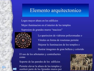El documento describe las características arquitectónicas del arte gótico en Europa, desde el siglo XII hasta el Renacimiento. Explica elementos como las bóvedas de crucería, los pilares, las vidrieras y cómo permitieron elevar la altura de los edificios. También menciona algunas de las catedrales góticas más importantes de cada periodo y país, como Notre Dame de París, la catedral de Toledo y la catedral de Burgos.