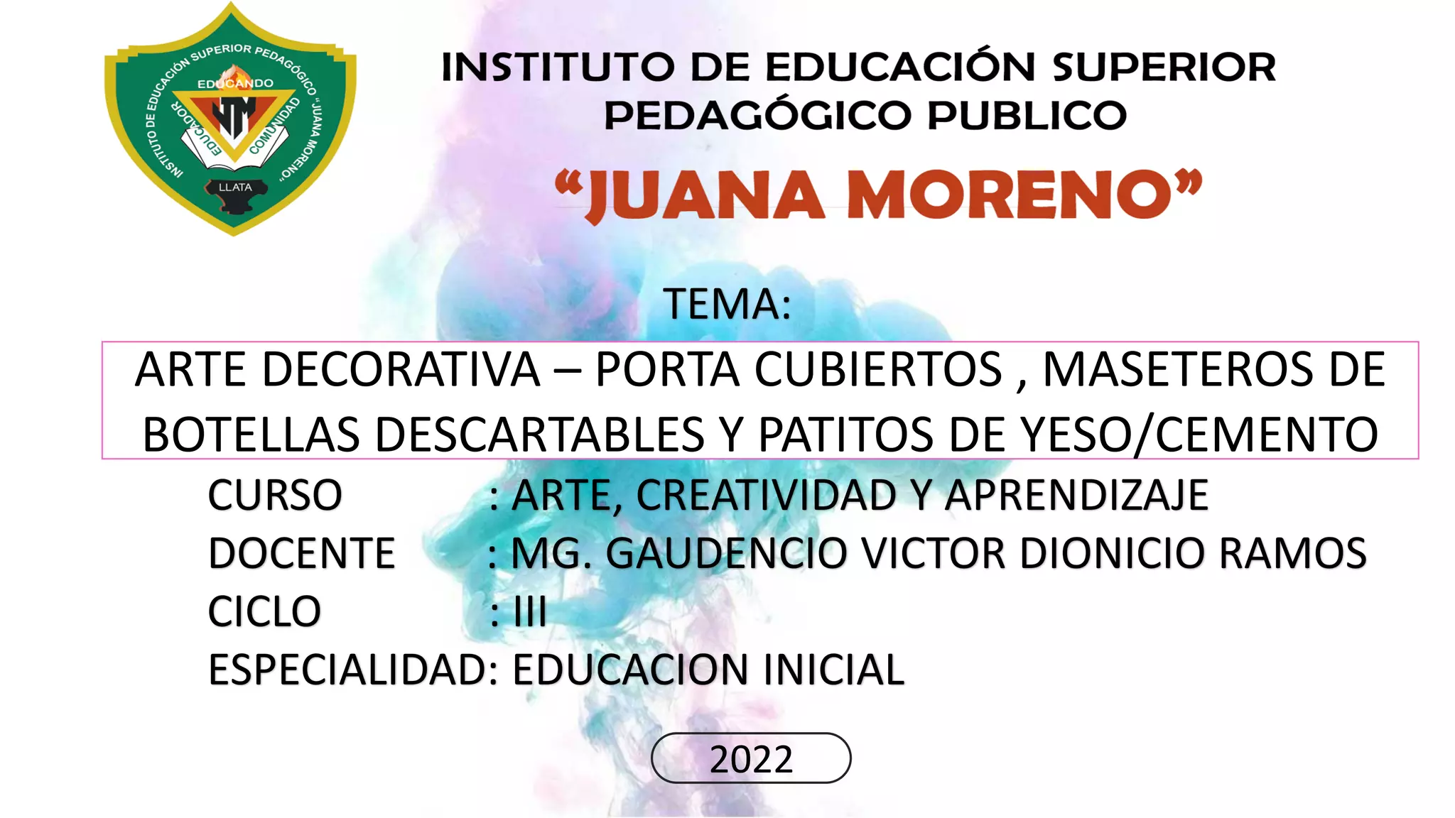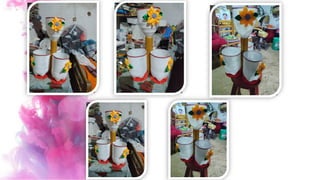 Este documento describe diferentes proyectos de arte decorativo realizados por estudiantes, incluyendo porta cubiertos hechos de botellas descartables, maceteros de botellas y patitos de yeso/cemento. Explica los materiales y pasos utilizados para crear cada proyecto.
