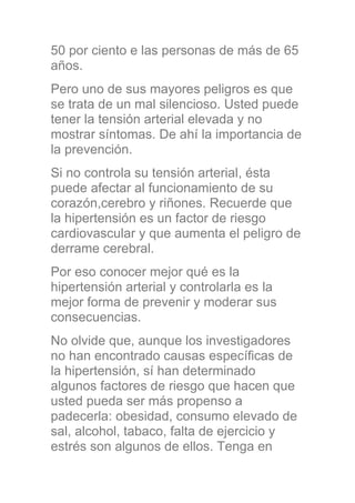 Este documento explica lo que es la hipertensión arterial. Define la hipertensión como una presión arterial sistólica de 140 mmHg o más, o una presión diastólica de 90 mmHg o más. Describe los factores de riesgo como la edad, el sobrepeso, el consumo de sal, tabaco y alcohol. Explica que la hipertensión puede dañar el corazón, cerebro y riñones, y aumentar el riesgo de accidente cerebrovascular. Resalta la importancia de controlar la presión arterial a través de un estilo de