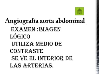 Este documento describe una angiografía abdominal, incluyendo la anatomía vascular relevante, el procedimiento, y lo que el paciente puede esperar. Se inyecta un medio de contraste a través de un catéter para visualizar el flujo sanguíneo en la aorta abdominal y sus ramas principales como el tronco celiaco, las arterias renales y mesentérica. El procedimiento involucra la inserción de un catéter a través de un vaso sanguíneo luego de aplicar anestesia local, para inyectar el contraste de forma controlada bajo monit