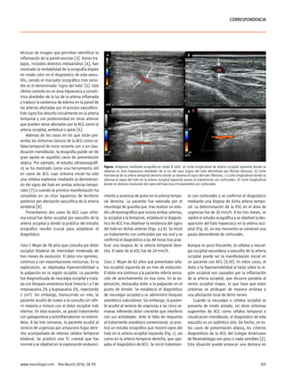 El documento describe dos casos de pacientes que presentaron dolor occipital como síntoma inicial de arteritis de células gigantes. En ambos casos, la ecografía dúplex en modo color mostró el "signo del halo" alrededor de la arteria occipital inflamada, lo que permitió establecer el diagnóstico de arteritis de células gigantes y tratar a los pacientes de forma adecuada con corticoides. El estudio ecográfico resultó ser una herramienta útil para diagnosticar esta vasculitis cuando los síntomas iniciales son at