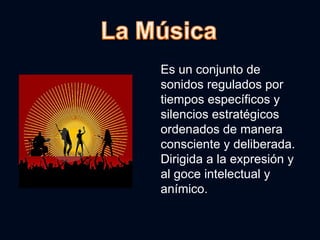 Este documento describe los elementos básicos de la música como el ritmo, la melodía y la armonía. Explica que el ritmo se refiere a la repetición de sonidos a intervalos regulares o irregulares, la melodía es la sucesión de sonidos agudos o graves que forman una canción, y la armonía es la producción simultánea de acordes con diferentes instrumentos. También describe las cualidades del sonido como la altura, intensidad, timbre y duración, e introduce los principales tipos de voces e instrumentos musicales.
