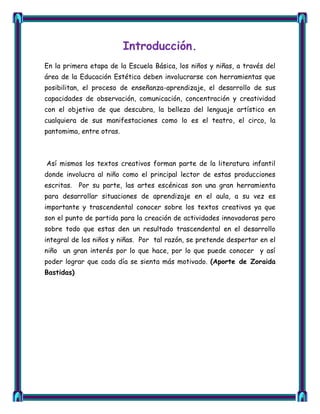 Este documento presenta información sobre textos creativos y artes escénicas en la cátedra de Educación Básica Integral de la Universidad de los Andes. Incluye la introducción de la profesora Betty Osorio y lista de estudiantes, seguido de definiciones y ejemplos de textos creativos, artes escénicas y su implementación en el aula.
