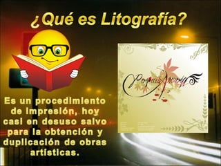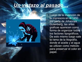 Las artes gráficas se refieren a las técnicas de impresión como la litografía y tipografía. Tras la invención de la imprenta por Johannes Gutenberg en 1450, surgen ramas como la litografía y serigrafía. Las artes gráficas combinan el arte de la impresión antigua y moderna usando herramientas como la imprenta o Photoshop.