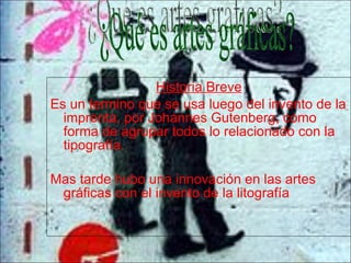 Este documento resume las principales formas de artes gráficas como la litografía, tipografía y grabado, describiendo los inventores Johannes Gutenberg y Aloys Senefelder. También explica brevemente conceptos como diseño, artes visuales, páginas web y programas de diseño gráfico. Finalmente, concluye que aprendió sobre las diferentes formas de artes gráficas y sus inventores.