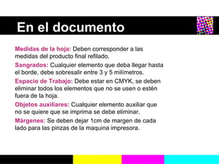 Este documento proporciona instrucciones sobre la preparación de archivos para impresión, incluyendo asegurar que las medidas, sangrados, espacio de trabajo y márgenes sean los adecuados, importar imágenes en lugar de copiarlas, evitar objetos y nodos excesivamente complejos, verificar los estilos de letra y transformaciones, establecer el espesor mínimo de líneas, convertir archivos a versiones compatibles, trabajar en CMYK, establecer la resolución de imágenes, convertir imágenes RGB a CMYK antes de import