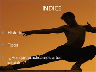 El documento analiza la historia y características de diversas artes marciales, incluyendo el karate, la capoeira, krav magá y muay boran, destacando sus orígenes, filosofías y técnicas. También se abordan las razones por las que la gente practica estas disciplinas, enfatizando la combinación de ejercicio físico y valores éticos. La información está sustentada con enlaces para profundizar en cada arte marcial mencionado.
