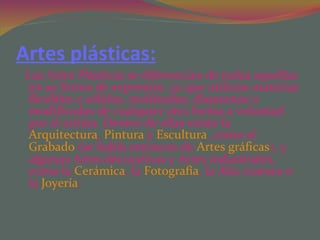 Las artes plásticas incluyen la arquitectura, pintura, escultura, grabado, cerámica, fotografía, alta costura y joyería. Utilizan materiales flexibles o sólidos que son moldeados o modificados por el artista para crear representaciones gráficas o figuras en volumen. Cada forma de arte plástico tiene sus propias técnicas y materiales, pero comparten el objetivo de expresión a través de la manipulación de sustancias.