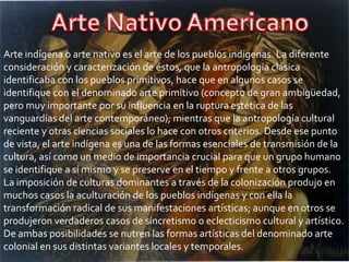 El arte indígena es una forma esencial de transmisión cultural y medio para la identidad de un grupo. Las culturas dominantes a través de la colonización produjeron a menudo la aculturación o sincretismo de las manifestaciones artísticas indígenas. El arte indígena incluye la música, danza y literatura oral, y suele carecer de pretensión de originalidad representando la continuidad de la tradición.