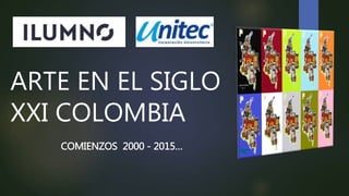 Este documento resume el arte en Colombia entre 2000 y 2015, destacando los temas reflexivos sobre problemas locales y mundiales, el uso de materiales no convencionales y la participación del público. También menciona eventos como la violencia política, el proceso de paz y la globalización que influyeron en los artistas colombianos durante este periodo. Presenta las obras y carreras de destacados artistas colombianos como Doris Salcedo, Rafael Gómez Barros y Oscar Muñoz.