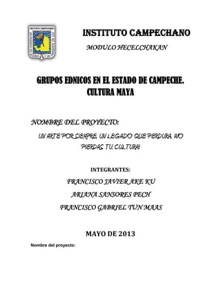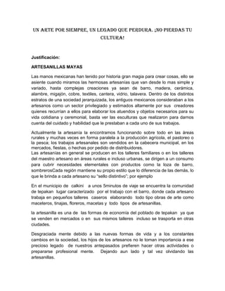 Este documento describe un proyecto para preservar las artesanías mayas en la comunidad de Tepakan en Campeche, México. El proyecto busca concientizar a los residentes, especialmente a los jóvenes, sobre la importancia de mantener vivas las tradiciones artesanales mayas a través de talleres, conferencias y una feria. El objetivo es preservar el legado cultural maya y mejorar las oportunidades económicas de la comunidad a través de la producción y venta continua de artesanías.