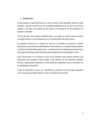 Este documento presenta una memoria sobre el uso de la arte terapia para fortalecer la autoestima en una persona con psicosis y retardo mental leve. En la introducción, describe el contexto y objetivos de la intervención realizada como parte de una práctica final para obtener el título de arte terapeuta. El marco teórico revisa los precursores históricos del uso del arte en salud mental, define conceptos como arte terapia, trastornos mentales severos y discapacidad intelectual, y analiza la representación plástica y la