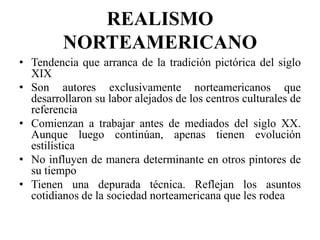 El documento resume el realismo norteamericano y el expresionismo abstracto del siglo XX, incluyendo artistas como Hopper, Wyeth, Pollock y Rothko. Luego describe el pop art con Warhol y Lichtenstein, el cinetismo de Vasarely, y tendencias posteriores como el hiperrealismo, la nueva figuración y el arte postmoderno. Cubre una amplia gama de movimientos artísticos del siglo XX en Estados Unidos y Europa.