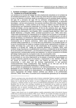Este documento analiza el coaching ejecutivo como servicio profesional de desarrollo personal en el contexto organizativo actual. Explica que los cambios en el mundo laboral han llevado a una mayor incertidumbre y flexibilidad, requiriendo profesionales adaptables con competencias genéricas. El coaching puede ayudar a desarrollar estas competencias para que los profesionales se reinventen y sobrevivan en un entorno de trabajo por proyectos. El documento también describe el diseño metodológico cualitativo del estudio piloto sobre coaching que se presenta