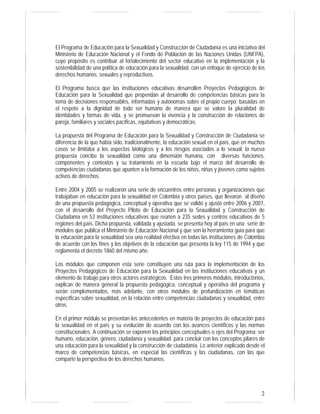 Este documento presenta los antecedentes y evolución de la educación para la sexualidad en Colombia. Explica que el actual Programa Nacional de Educación para la Sexualidad y Construcción de Ciudadanía se creó en 2007 tras varios años de diálogos y un piloto en 53 instituciones educativas, con el fin de promover una educación basada en los derechos humanos y no solo en aspectos biológicos. El documento también describe los tres primeros módulos del programa, los cuales presentan los principios conceptuales, características de los pro