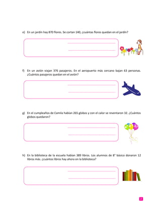 Este documento presenta una guía de actividades para resolver problemas de adición y sustracción con números de 3 dígitos. Incluye 10 problemas que involucran sumar y restar cantidades de dulces, yogurt, cajas de leche, cajas de frutilla, flores, pasajeros de avión, globos y libros. También incluye 2 problemas adicionales sobre el costo de peras y la cantidad de tela restante para fabricar ropa.