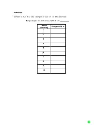 El documento describe un experimento para estudiantes sobre cómo la energía del sol afecta la temperatura del aire dentro de latas de bebida de diferentes colores. Los estudiantes pintan latas vacías con diferentes colores de pintura y miden la temperatura dentro de cada lata cada minuto durante 10 minutos cuando están expuestas al sol. Luego grafican los resultados y analizan qué color permitió que la temperatura subiera más, comparando sus hallazgos con los de otros grupos.