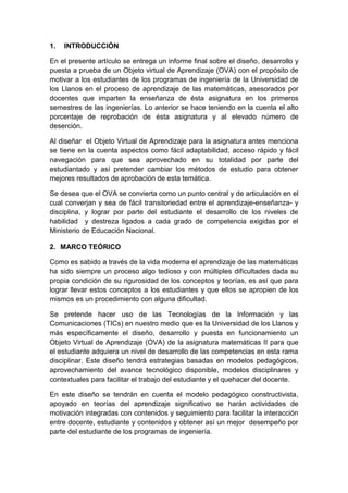 Este documento describe el diseño y desarrollo de un Objeto Virtual de Aprendizaje (OVA) para la enseñanza de las matemáticas en la Universidad de los Llanos. El OVA se centra en temas de cálculo como integrales indefinidas, definidas y áreas bajo la curva. El diseño del OVA sigue un enfoque pedagógico constructivista y aprovecha las TIC para facilitar el aprendizaje de los estudiantes, mejorando los resultados académicos. El OVA fue codificado usando HTML5 y CSS