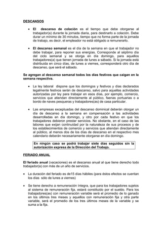 La jornada laboral máxima es de 45 horas semanales distribuidas en hasta 10 horas diarias de lunes a sábado. El trabajo extraordinario no puede exceder 2 horas diarias y debe pagarse con un recargo mínimo del 50%. Todos tienen derecho a 15 días hábiles de vacaciones anuales pagadas después de un año de servicio, así como a descansos semanales y festivos.
