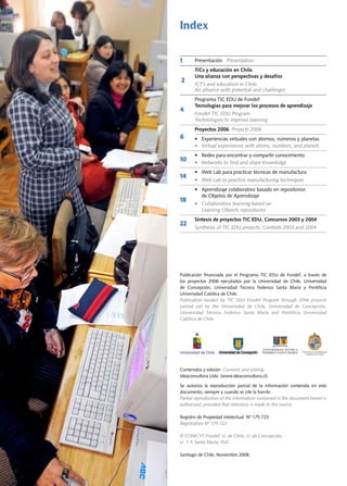 Este documento describe el programa TIC EDU de Fondef, el cual tiene como objetivo mejorar los procesos de aprendizaje mediante soluciones que incluyen el uso de TICs. Se explica que el programa busca impulsar la investigación aplicada, desarrollar capacidades científico-tecnológicas y favorecer la transferencia de resultados al sector educativo. Además, la publicación presenta los resultados más relevantes de los proyectos apoyados por el programa entre 2006 y 2008, con el fin de darlos a conocer a actores clave vinculados a