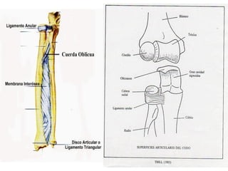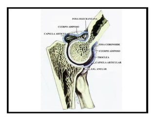 El codo está compuesto de tres articulaciones - la articulación húmero-cubital, la articulación húmero-radial y la articulación radio-cubital proximal. Juntas, estas articulaciones permiten los movimientos de flexión, extensión y pronosupinación del antebrazo. Están unidas por una cápsula articular común y superficies articulares que incluyen la tróclea humeral, la cavidad sigmoidea mayor y menor, y las carillas del radio y cúbito.
