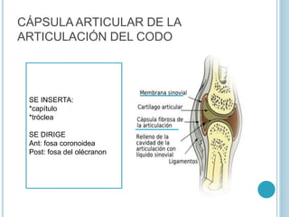 Este documento describe las articulaciones del codo y radiocubital proximal. Detalla las superficies articulares, cápsulas, ligamentos, movimientos, músculos, vascularización y bolsas de estas articulaciones. Explica que la articulación del codo incluye el capítulo, tróclea y fosa coronoidea y olécranon, y está rodeada por ligamentos y movida por músculos como el braquial, bíceps y tríceps. También describe las características similares de la articulación radiocubital