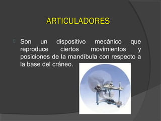 Los articuladores son dispositivos mecánicos que reproducen los movimientos de la mandíbula. Se utilizan para diagnóstico, planificación de tratamiento y tratamiento dental al permitir el análisis de los movimientos mandibulares y la prueba de restauraciones. Existen diferentes tipos como los no ajustables, semiajustables y ajustables, siendo estos últimos los más sofisticados que reproducen la mayoría de los movimientos.